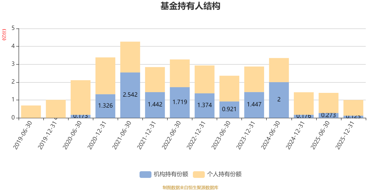 截至2025年12月31日,基金持有人共计5.84万户,合计持有1亿份。其中管理人员工持有2.04万份,占比0.02%,机构持有份额占比12.49%,个人投资者占比87.51%。