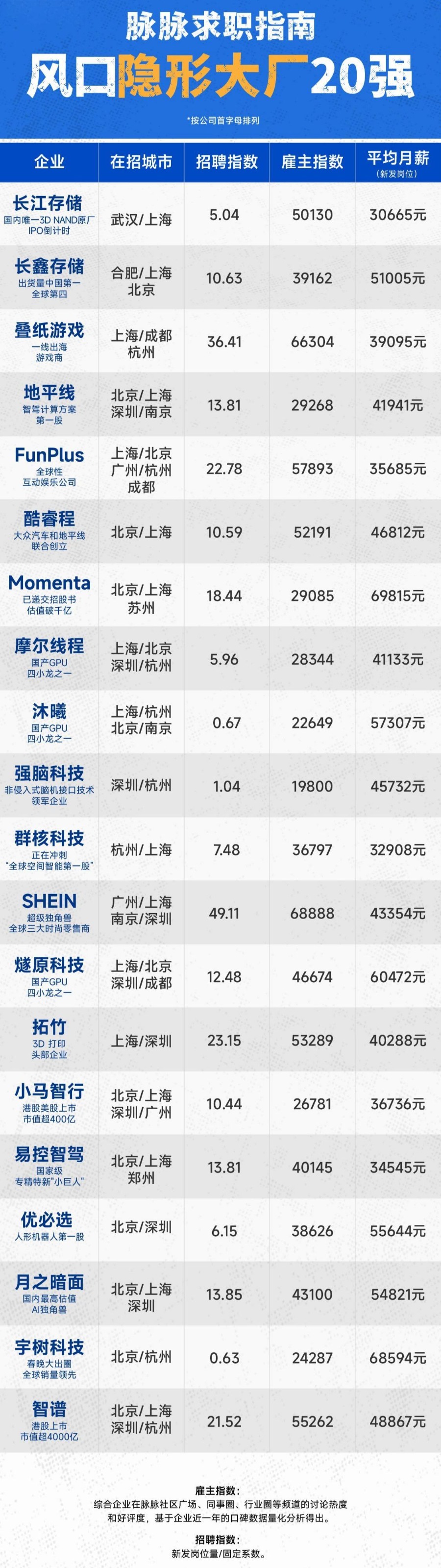 4月9日,职场社区平台脉脉发布80家“隐形大厂”名单,涵盖智谱、SHEIN、地平线、Momenta等企业,覆盖AI、智能驾驶、机器人、芯片等热门赛道。名单显示,高薪岗位正加速从传统大厂向一批高速发展的“隐形大厂”扩展。