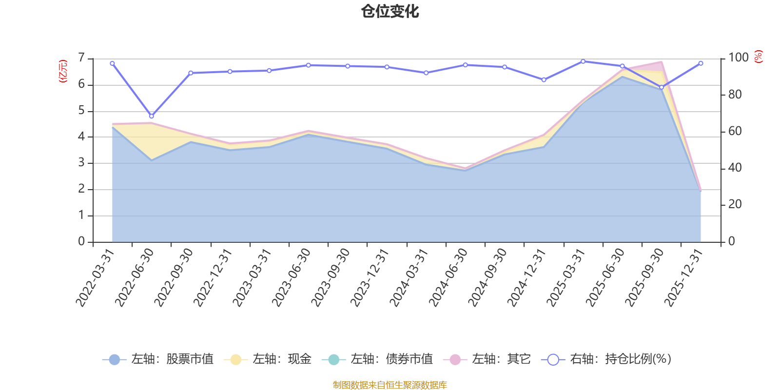 据定期报告数据统计,近三年平均股票仓位为94.14%,同类平均为86.12%。2025年一季度末基金达到98.46%的最高仓位,2022年上半年末最低,为68.59%。