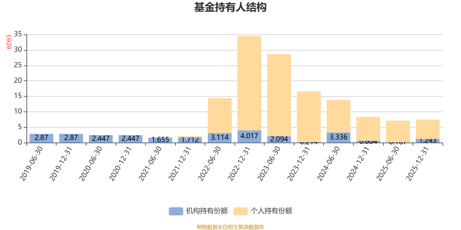 截至2025年12月31日,基金持有人共计13.75万户,合计持有7.48亿份。其中管理人员工持有6.76万份,占比0.01%,机构持有份额占比16.61%,个人投资者占比83.39%。