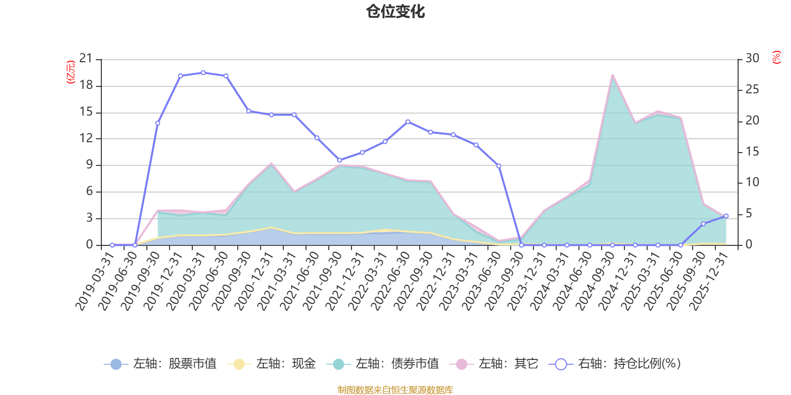 据定期报告数据统计,近三年平均股票仓位为3.09%,同类平均为20.99%。2020年一季度末基金达到27.84%的最高仓位,2025年三季度末最低,为3.46%。