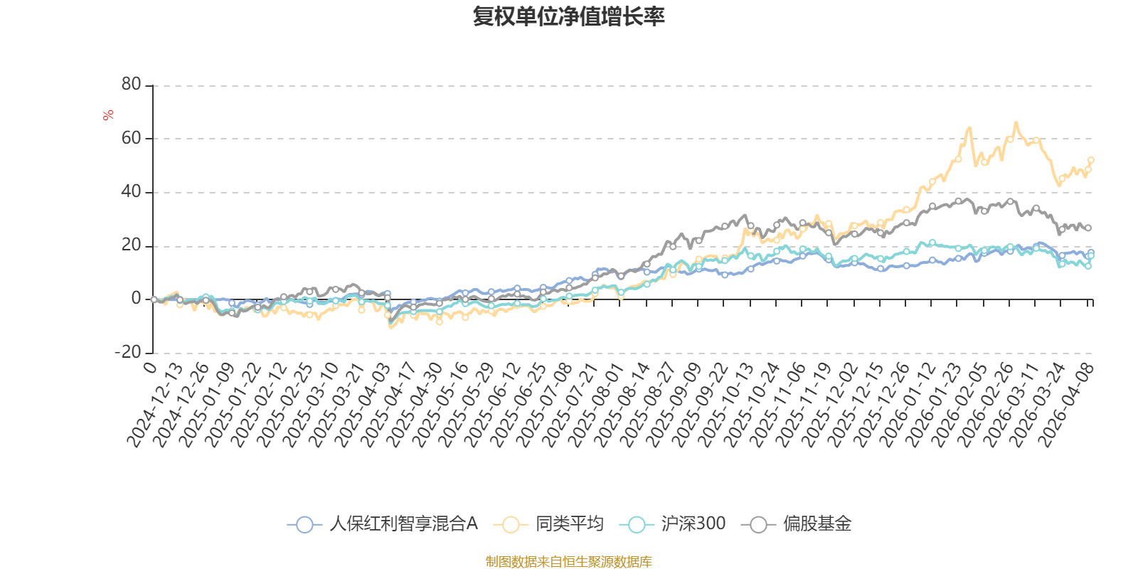 截至4月8日,人保红利智享混合A近三个月复权单位净值增长率为3.30%,位于同类可比基金32/49;近半年复权单位净值增长率为7.16%,位于同类可比基金40/49;近一年复权单位净值增长率为21.60%,位于同类可比基金43/48。