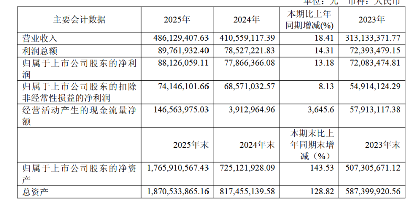 2025年,该公司实现营业收入4.86亿元,较上年同期增长18.41%;实现净利润8812.61万元,较上年同期增长13.18%;实现扣非后净利润7414.61万元,较上年同期增长8.13%。
