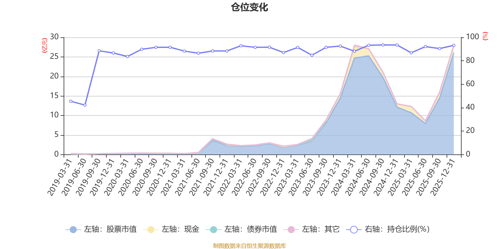 据定期报告数据统计,近三年平均股票仓位为90.93%,同类平均为72.57%。2024年三季度末基金达到93.54%的最高仓位,2019年上半年末最低,为42.19%。