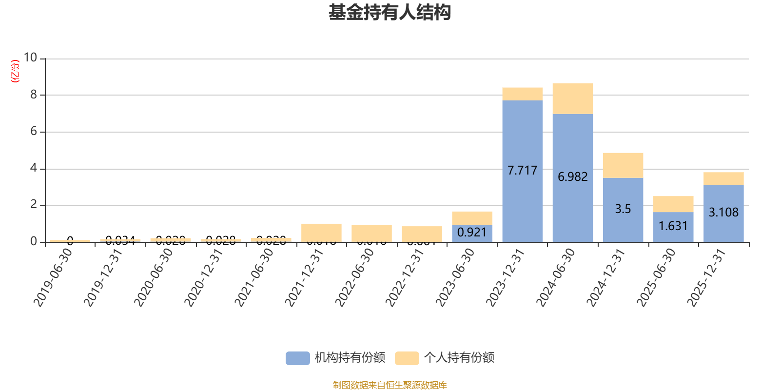 截至2025年12月31日,基金持有人共计1.63万户,合计持有3.8亿份。其中管理人员工持有66.04万份,占比0.17%,机构持有份额占比81.73%,个人投资者占比18.27%。