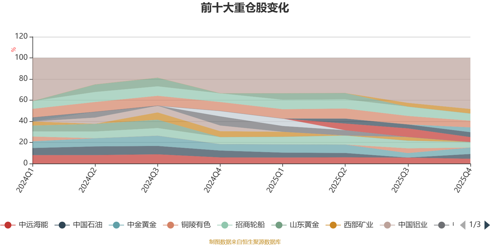 该基金持股集中度较高。截至2025年末,基金十大重仓股分别是洛阳钼业、紫金矿业、中金黄金、招商轮船、赤峰黄金、盛达资源、中国神华、中远海能、中国石油、华友钴业。