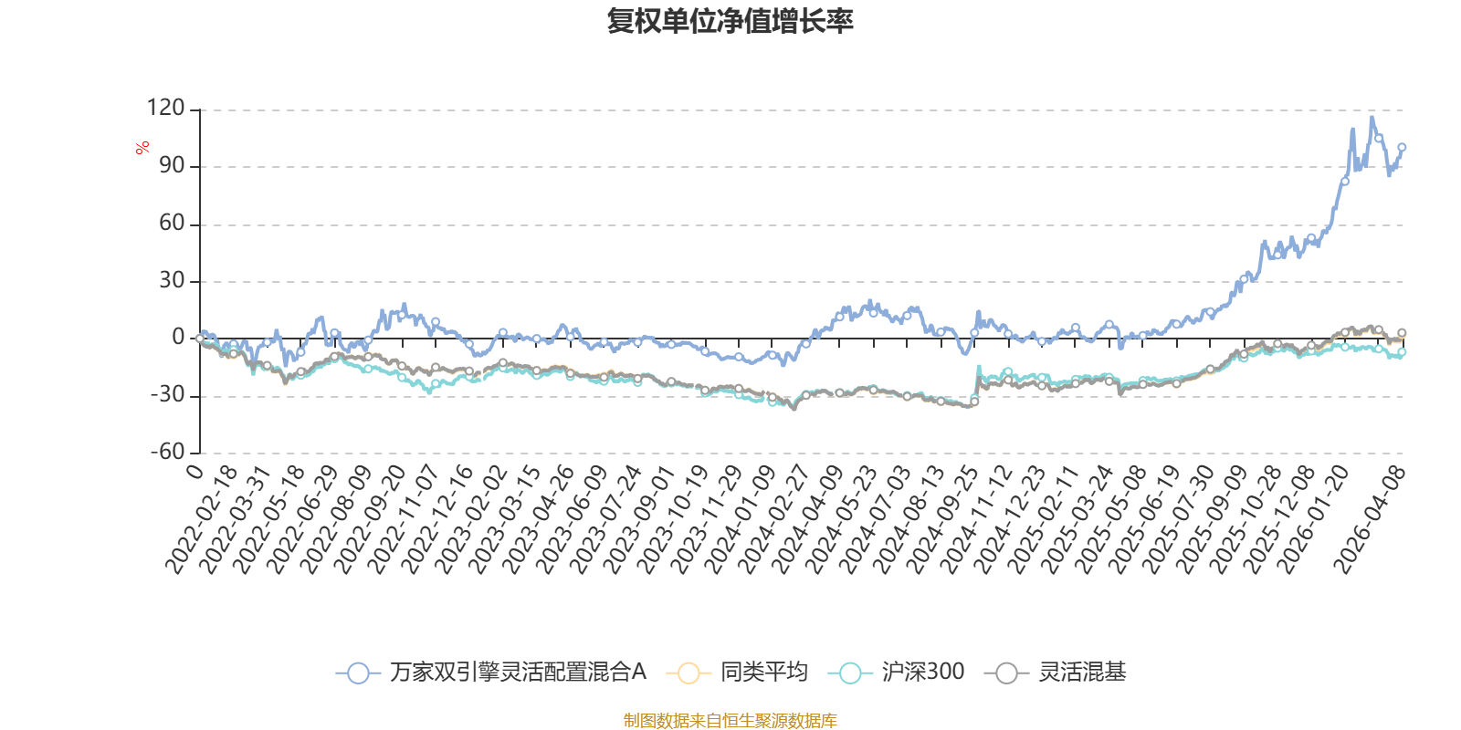 截至4月8日,万家双引擎灵活配置混合A近三个月复权单位净值增长率为19.57%,位于同类可比基金22/1287;近半年复权单位净值增长率为39.93%,位于同类可比基金12/1286;近一年复权单位净值增长率为111.42%,位于同类可比基金49/1286;近三年复权单位净值增长率为98.89%,位于同类可比基金35/1286。