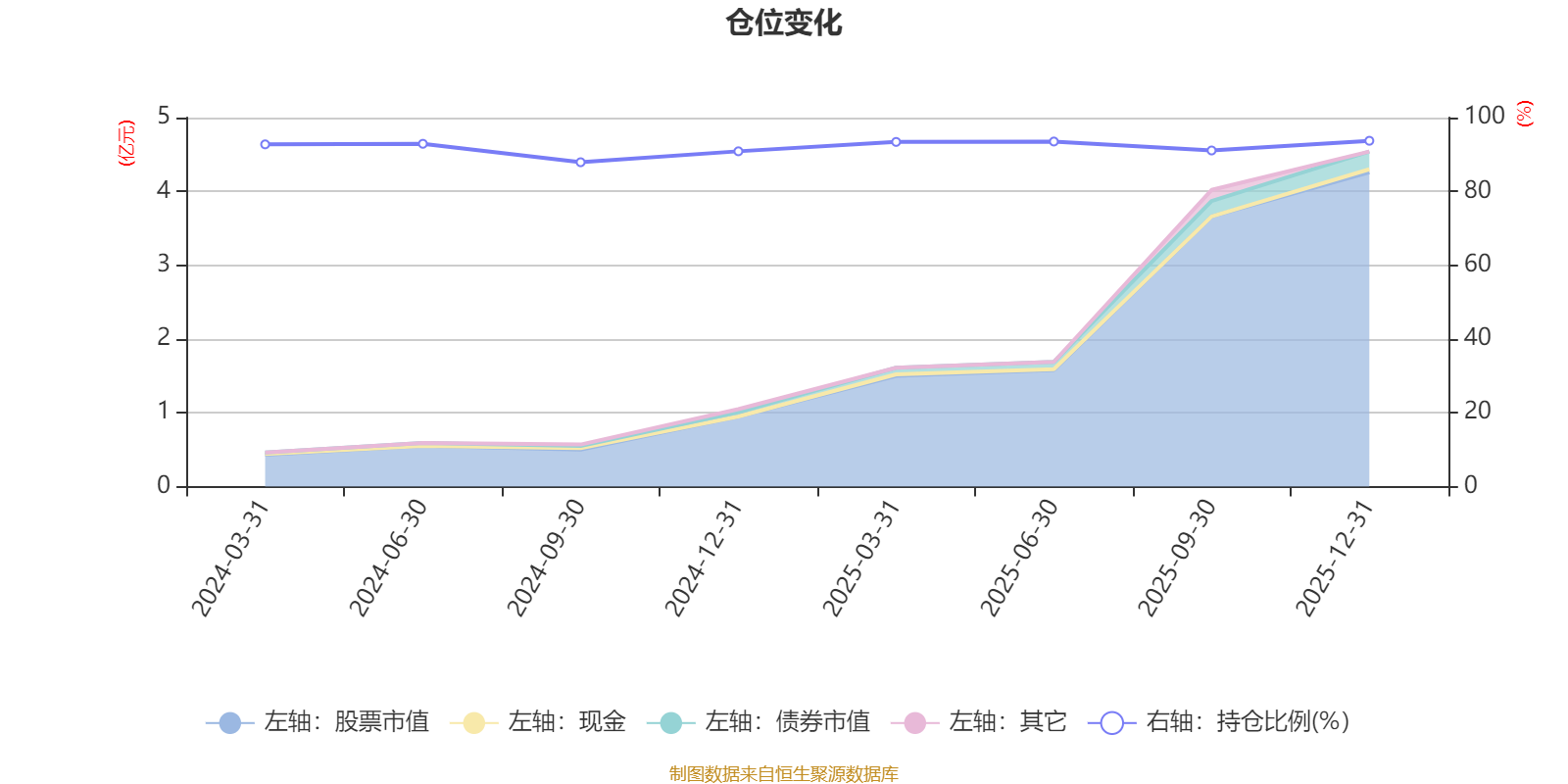 据定期报告数据统计,成立以来平均股票仓位为92.02%,同类平均为87.26%。2025年末基金达到93.72%的最高仓位,2024年三季度末最低,为87.9%。