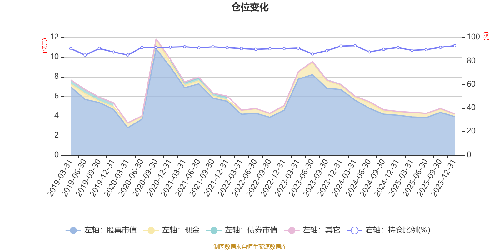 据定期报告数据统计,近三年平均股票仓位为90.34%,同类平均为72.57%。2025年末基金达到93.04%的最高仓位,2019年上半年末最低,为85.1%。