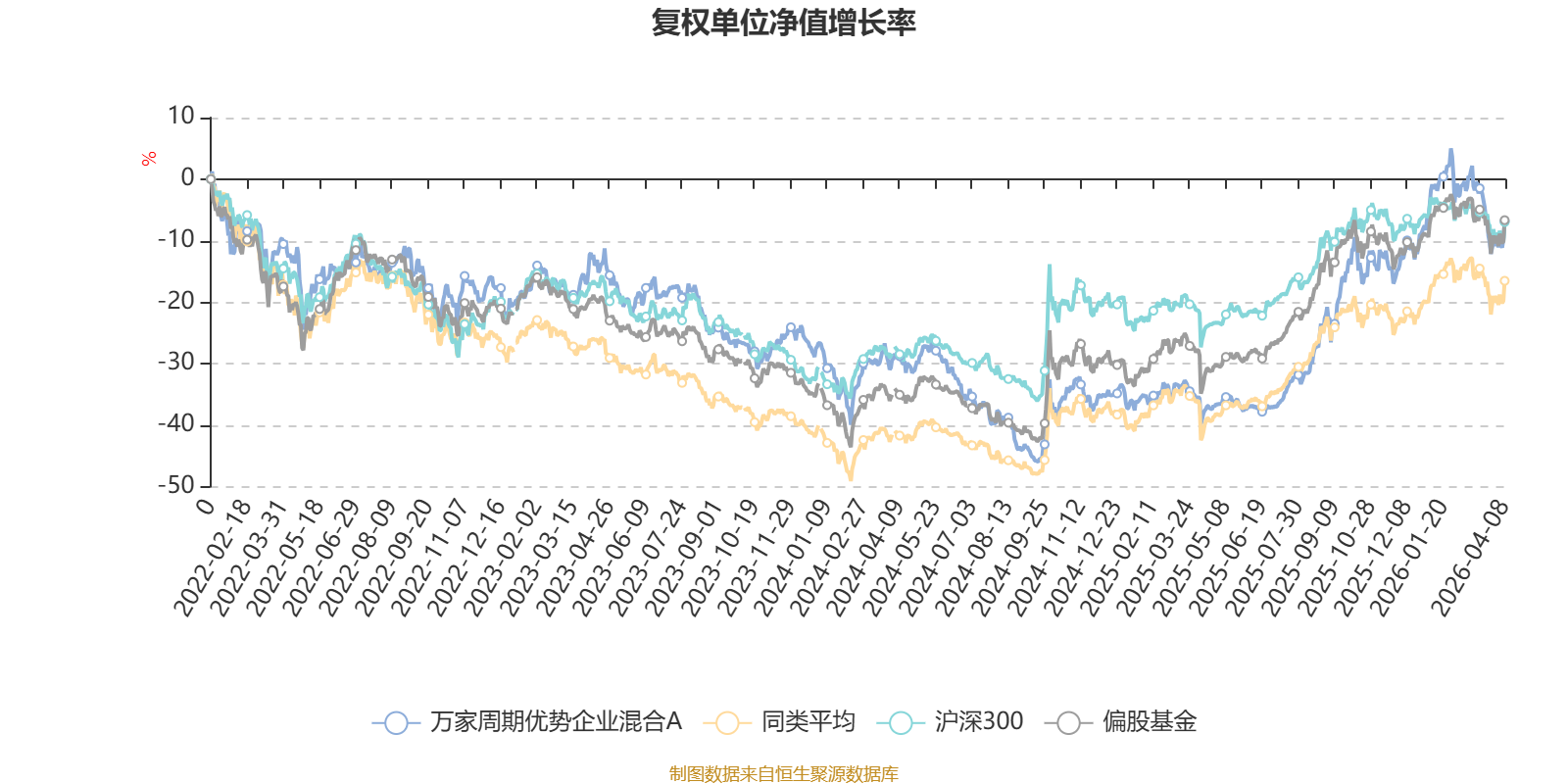 截至4月8日,万家周期优势企业混合A近三个月复权单位净值增长率为-5.54%,位于同类可比基金556/689;近半年复权单位净值增长率为4.89%,位于同类可比基金280/689;近一年复权单位净值增长率为52.75%,位于同类可比基金210/685;近三年复权单位净值增长率为6.21%,位于同类可比基金248/417。
