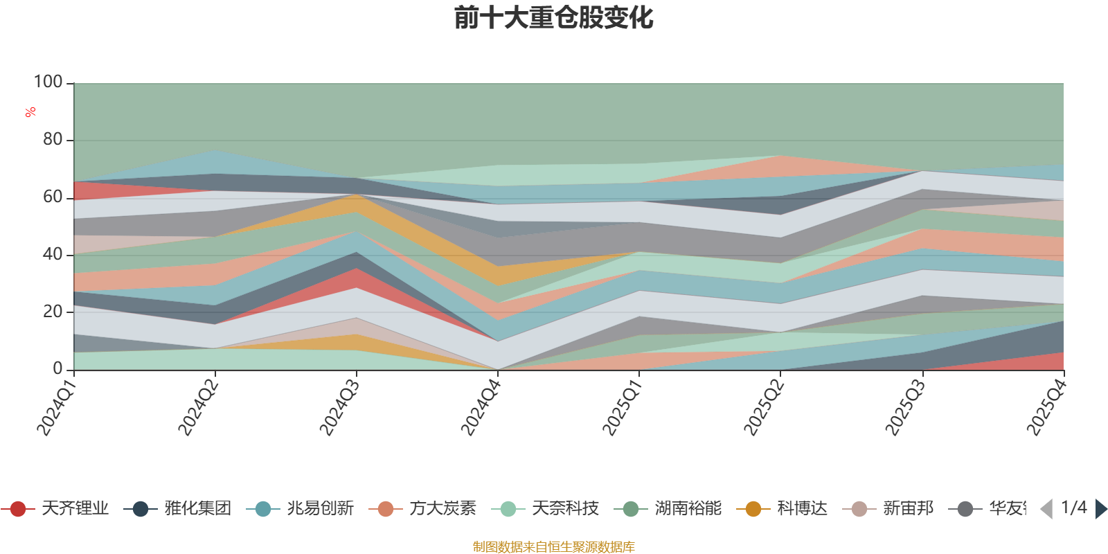 该基金持股集中度较高,近2年前十大重仓股集中度长期超过60%。截至2025年末,基金十大重仓股分别是雅化集团、宁德时代、天赐材料、恩捷股份、璞泰来、天齐锂业、湖南裕能、豪威集团、科达利、亿纬锂能。