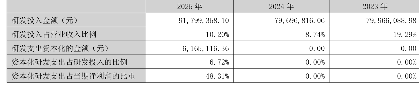 2025年全年,公司研发投入金额为9179.94万元,同比增长15.19%;研发投入占营业收入比例为10.2%,相比上年同期上升1.46个百分点。此外,公司全年研发投入资本化率为6.72%。