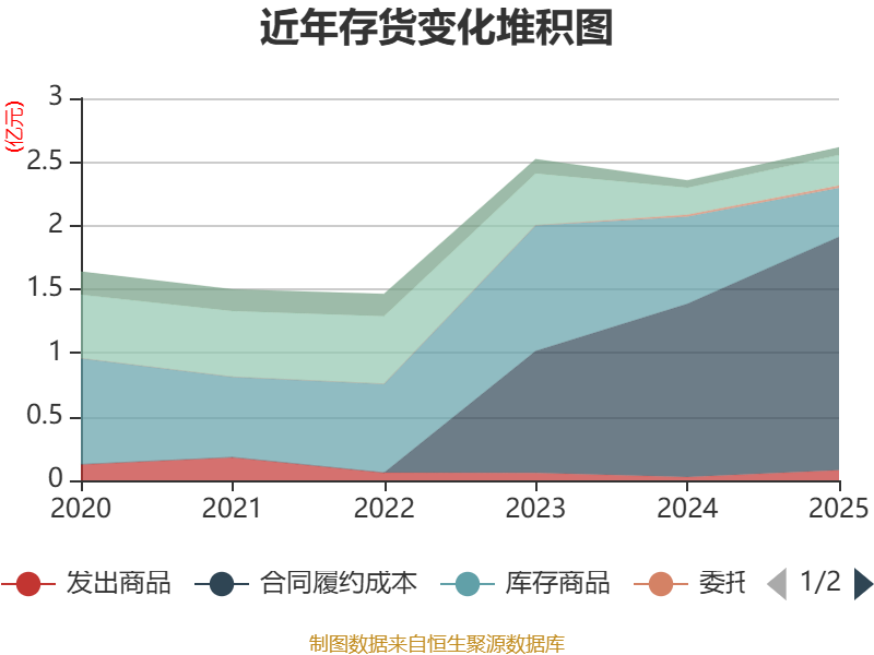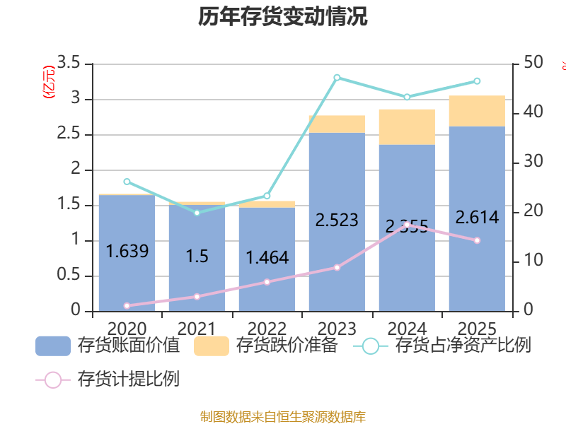 从存货变动来看,截至2025年末,公司存货账面价值为2.61亿元,占净资产的46.47%,较上年末增加2585.53万元。其中,存货跌价准备为4344.96万元,计提比例为14.25%。