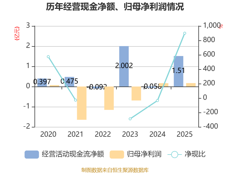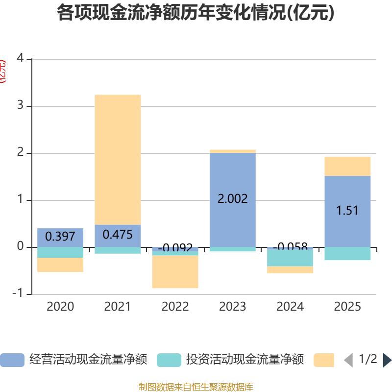 截至2025年,公司经营活动现金流净额为1.51亿元,同比增加1.57亿元;筹资活动现金流净额4088.22万元,同比增加5532.53万元;投资活动现金流净额-2809.94万元,上年同期为-3548.05万元。