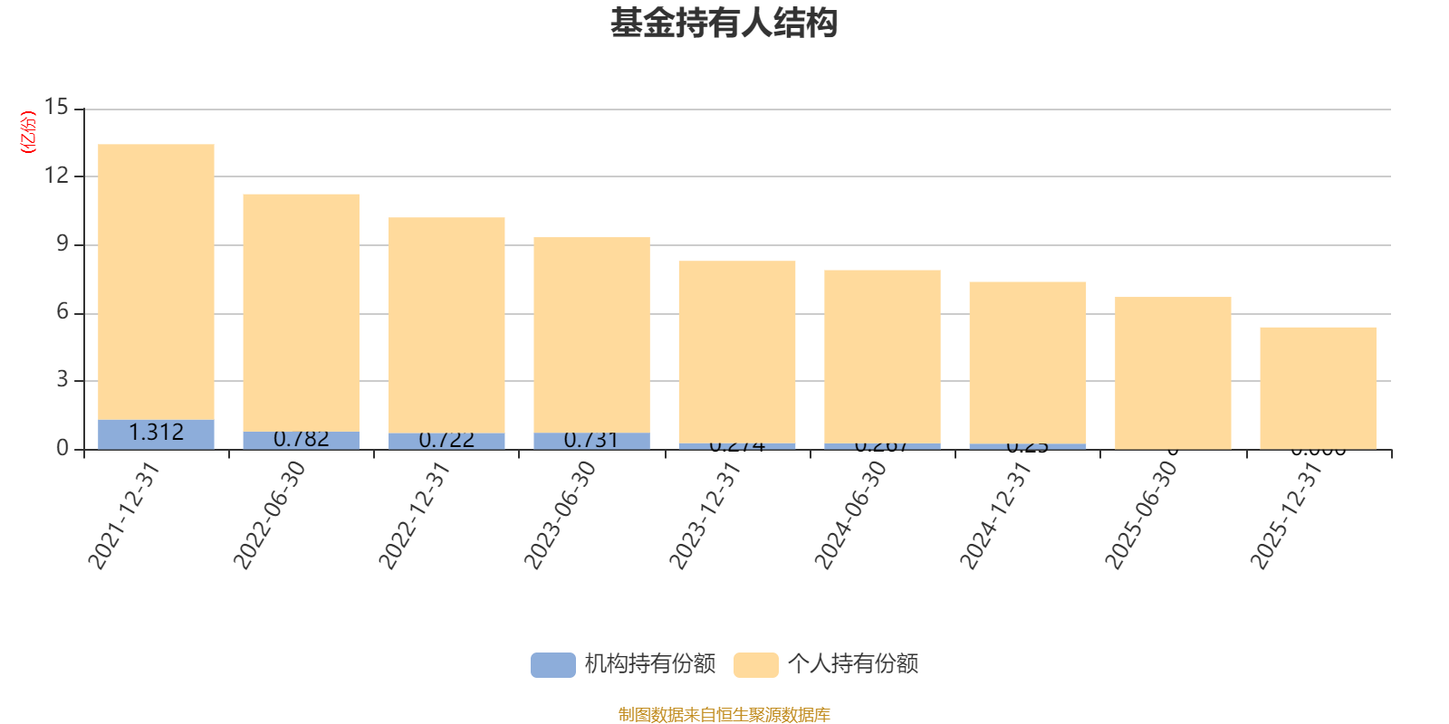 截至2025年12月31日,基金持有人共计5.74万户,合计持有5.37亿份。其中管理人员工持有198.78万份,占比0.37%,机构持有份额占比0.11%,个人投资者占比99.89%。