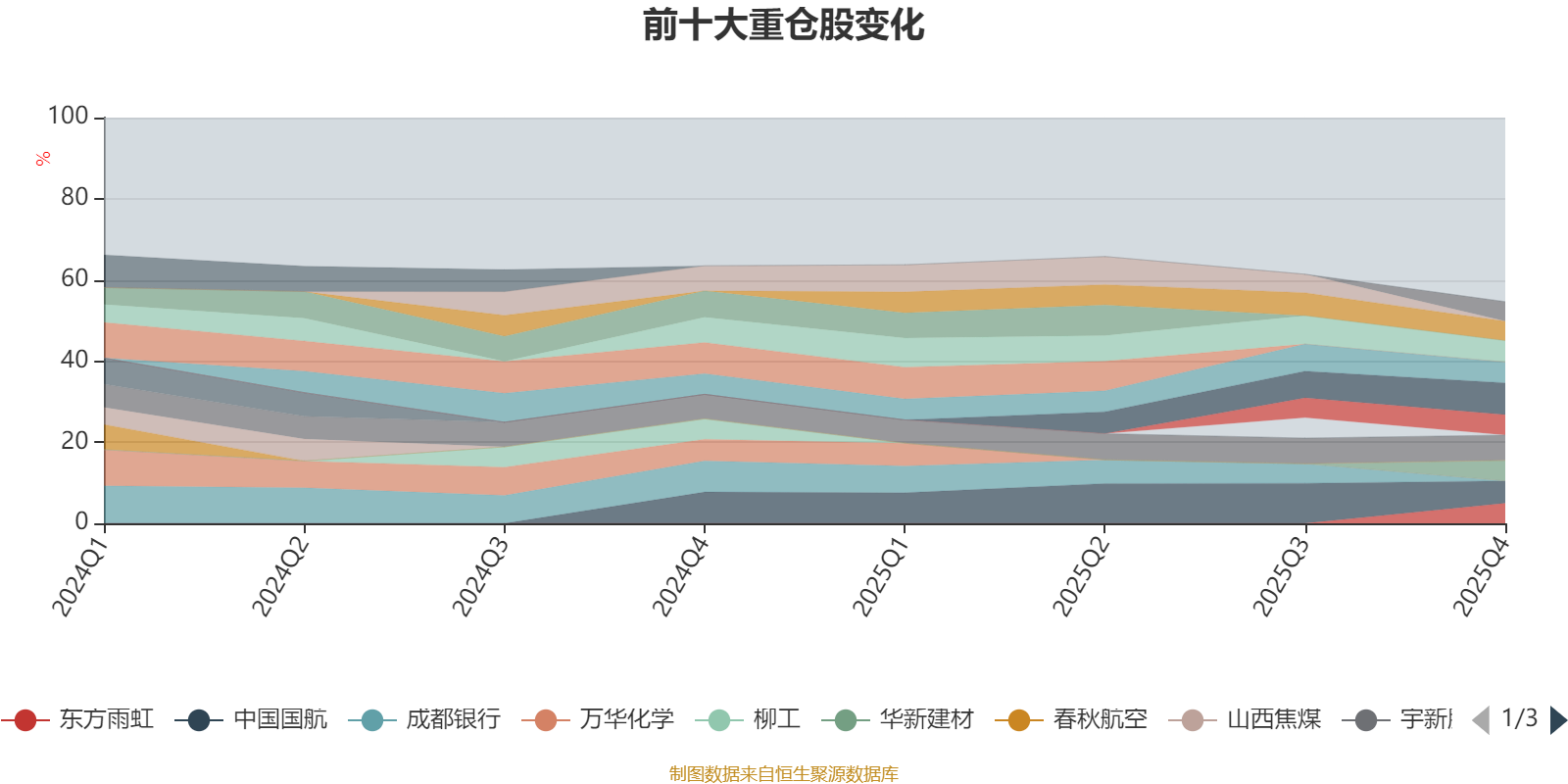 该基金持股集中度较高。截至2025年末,基金十大重仓股分别是江河集团、宇新股份、中国国航、鸿路钢构、龙湖集团、华新建材、建发国际集团、东方雨虹、中国东方航空股份、华鲁恒升。
