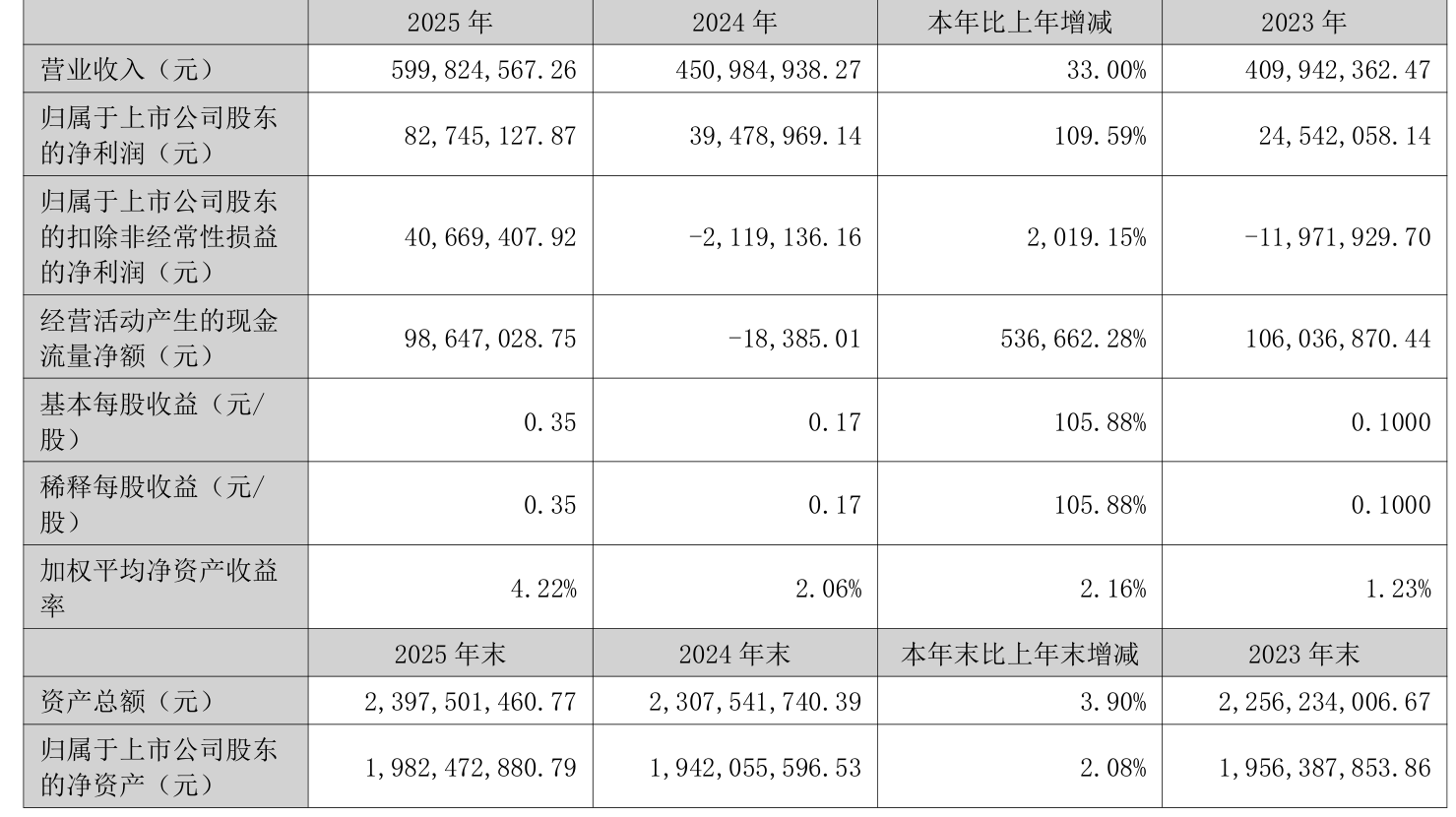 中证智能财讯智莱科技(300771)4月10日披露2025年年度报告。2025年,公司实现营业总收入6亿元,同比增长33.00%;归母净利润8274.51万元,同比增长109.59%;扣非净利润4066.94万元,同比扭亏;经营活动产生的现金流量净额为9864.7万元,上年同期为-1.84万元;报告期内,智莱科技基本每股收益为0.35元,加权平均净资产收益率为4.22%。公司2025年度分配预案为:拟向全体股东每10股派现2元(含税)。