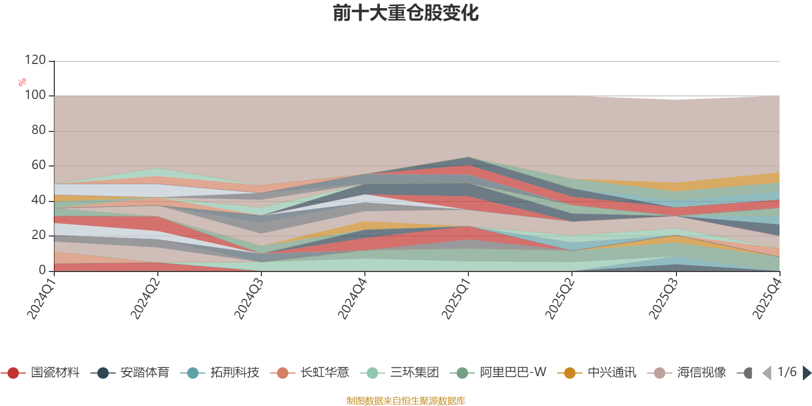 截至2025年末,基金十大重仓股分别是阿里巴巴-W、华勤技术、腾讯控股、柏楚电子、中芯国际、海光信息、杰华特、牧原股份、建滔积层板、伟测科技。