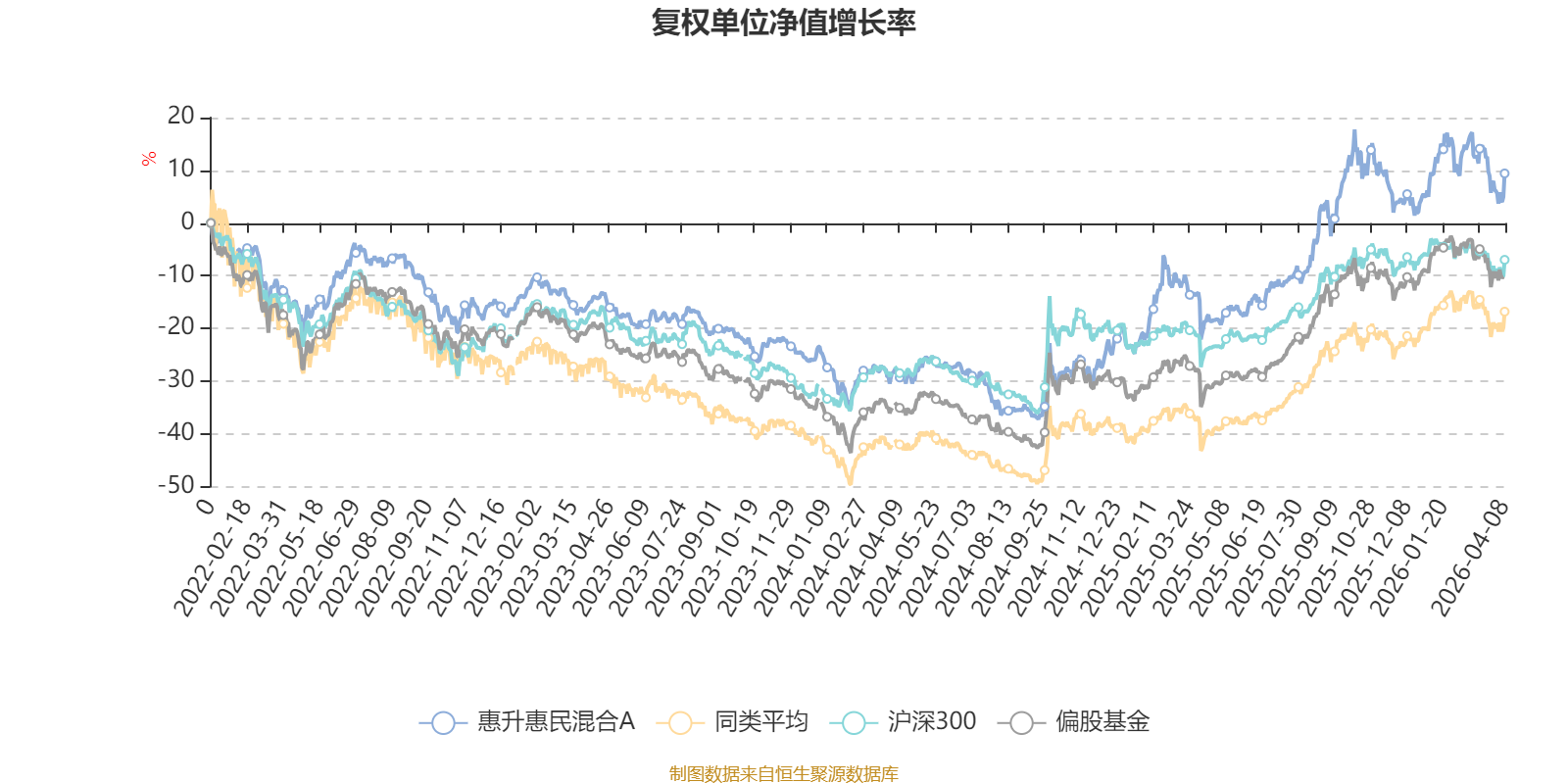 截至4月8日,惠升惠民混合A近三个月复权单位净值增长率为0.19%,位于同类可比基金306/621;近半年复权单位净值增长率为-4.21%,位于同类可比基金470/621;近一年复权单位净值增长率为38.38%,位于同类可比基金341/618;近三年复权单位净值增长率为27.08%,位于同类可比基金194/559。