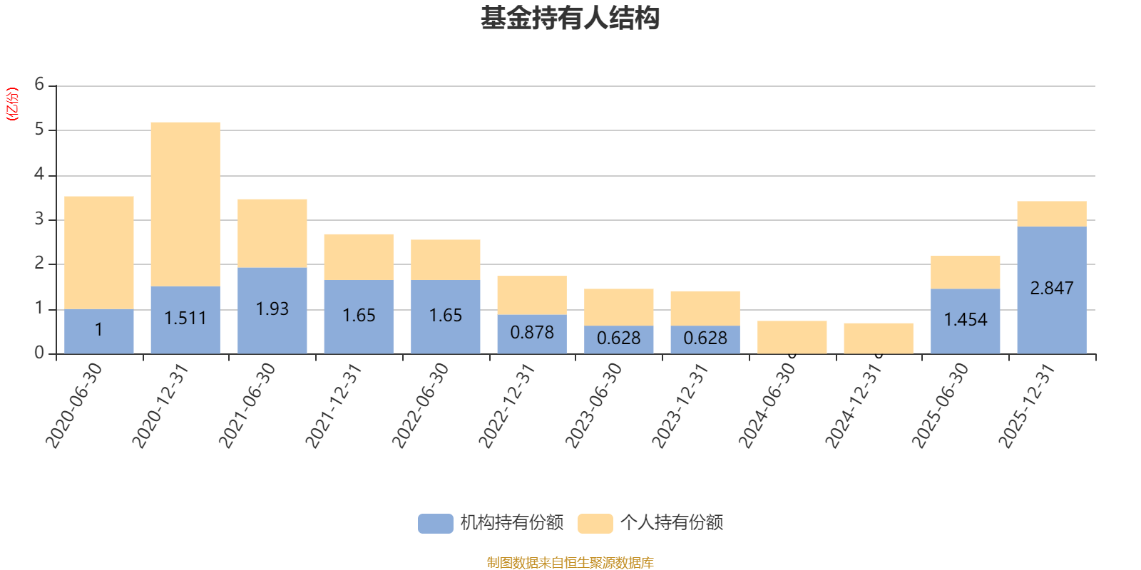 截至2025年12月31日,基金持有人共计1360户,合计持有3.41亿份。其中管理人员工持有64.62万份,占比0.19%,机构持有份额占比83.45%,个人投资者占比16.55%。