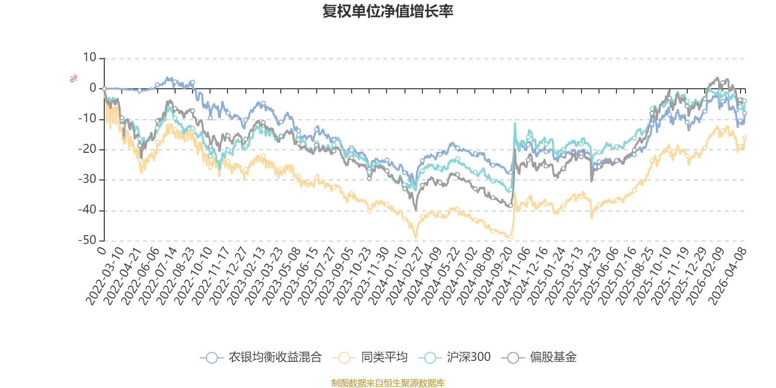 截至4月8日,农银均衡收益混合近三个月复权单位净值增长率为-3.65%,位于同类可比基金451/621;近半年复权单位净值增长率为-1.67%,位于同类可比基金416/621;近一年复权单位净值增长率为26.61%,位于同类可比基金456/618;近三年复权单位净值增长率为-0.36%,位于同类可比基金424/559。
