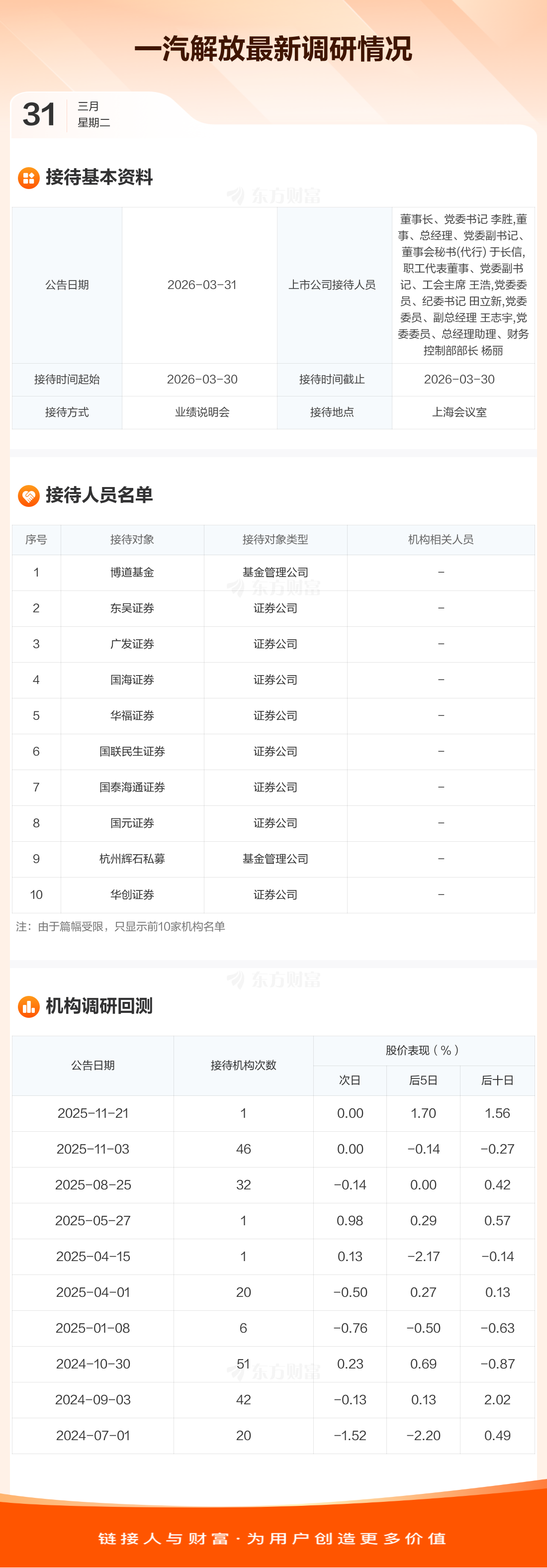 一汽解放3月31日公告称,3月30日接待博道基金等25家机构调研。接待人员包括董事长、党委书记 李胜,董事、总经理、党委副书记、董事会秘书(代行) 于长信,职工代表董事、党委副书记、工会主席 王浩,党委委员、纪委书记 田立新,党委委员、副总经理 王志宇,党委委员、总经理助理、财务控制部部长 杨丽。