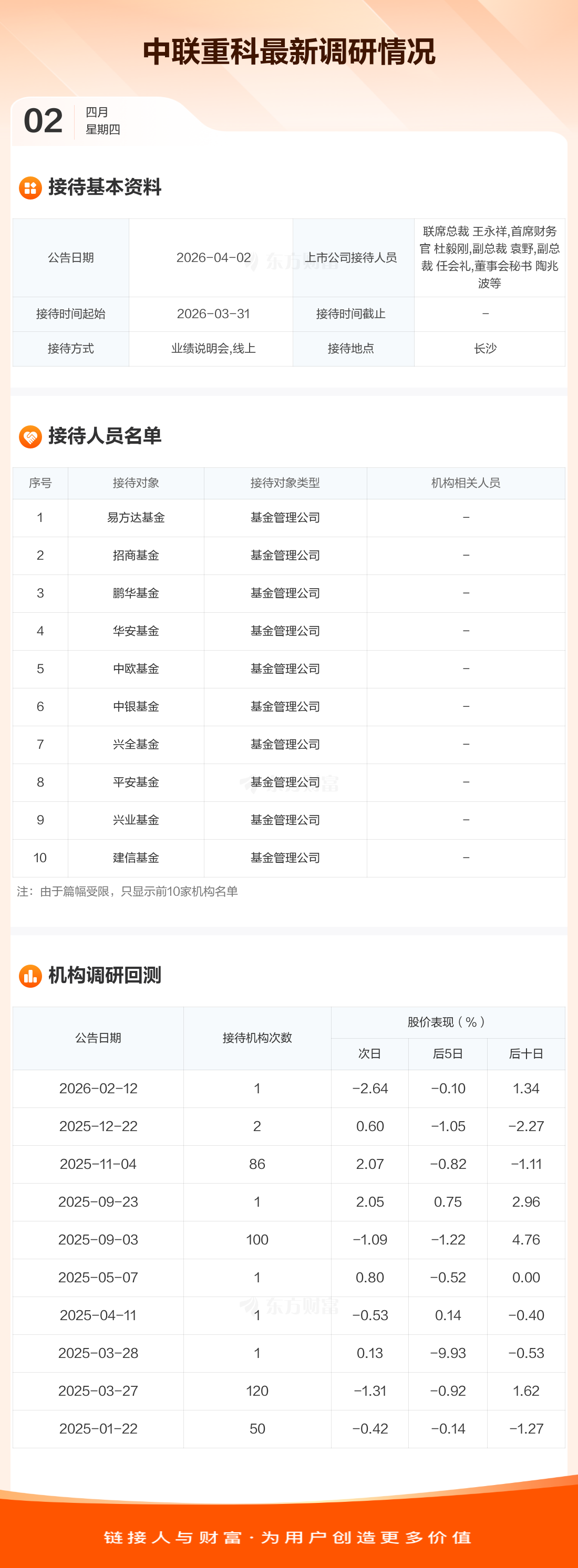 中联重科4月2日公告称,3月31日接待易方达基金等89家机构调研。接待人员包括联席总裁 王永祥,首席财务官 杜毅刚,副总裁 袁野,副总裁 任会礼,董事会秘书 陶兆波等。