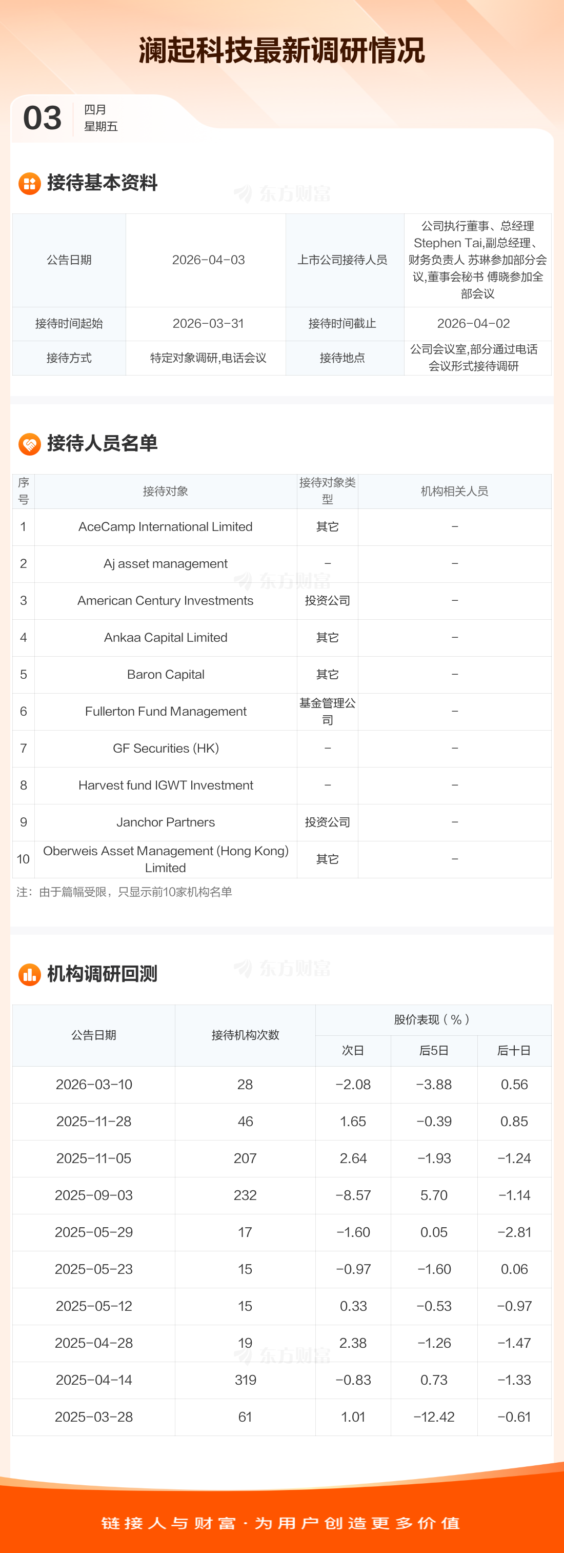 澜起科技4月3日公告称,3月31日至4月2日接待AceCamp International Limited等249家机构调研。接待人员包括公司执行董事、总经理 Stephen Tai,副总经理、财务负责人 苏琳参加部分会议,董事会秘书 傅晓参加全部会议。