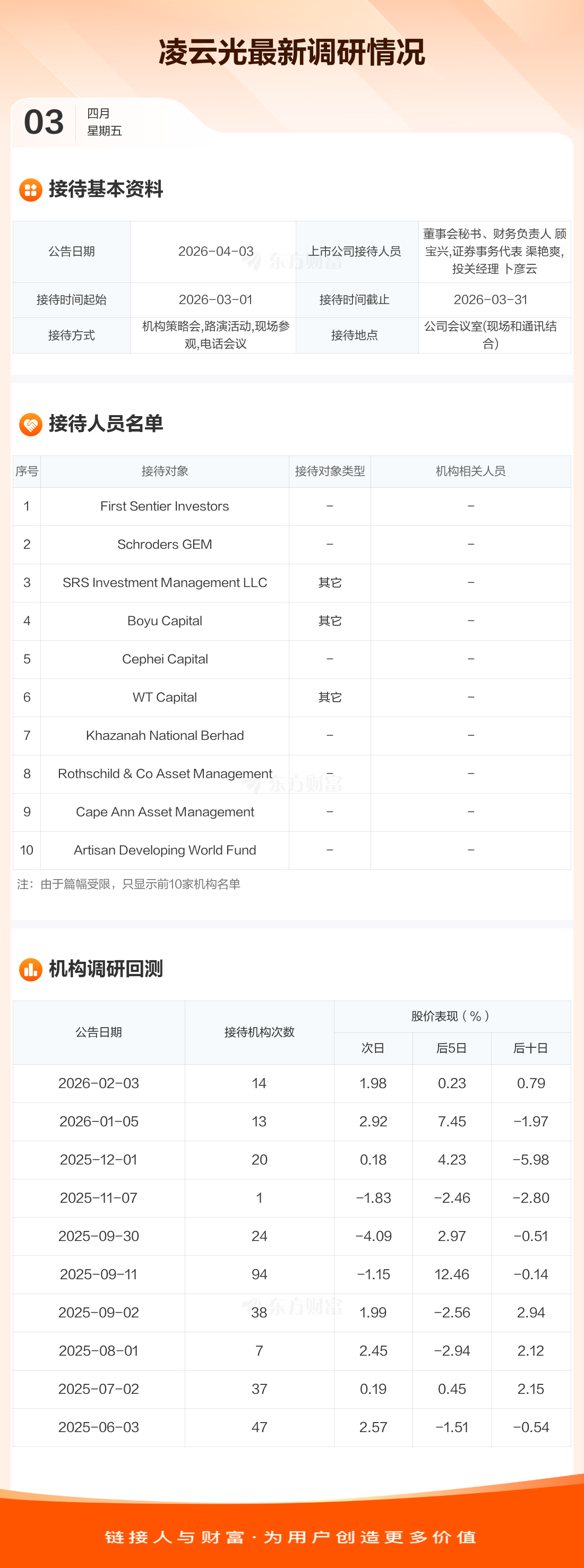 凌云光4月3日公告称,3月1日至3月31日接待First Sentier Investors等64家机构调研。接待人员包括董事会秘书、财务负责人 顾宝兴,证券事务代表 渠艳爽,投关经理 卜彦云。