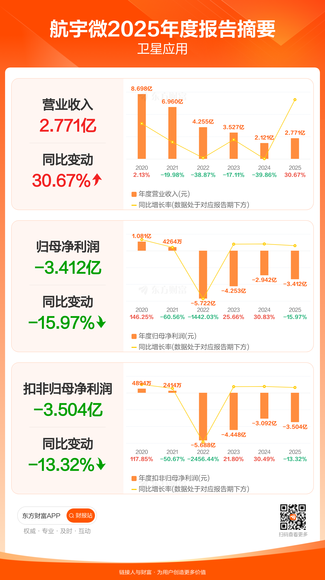 航宇微4月10日发布2025年年报显示,公司全年实现营业收入2.77亿元,同比增长30.67%;归母净利润-3.41亿元;扣非归母净利润-3.50亿元。