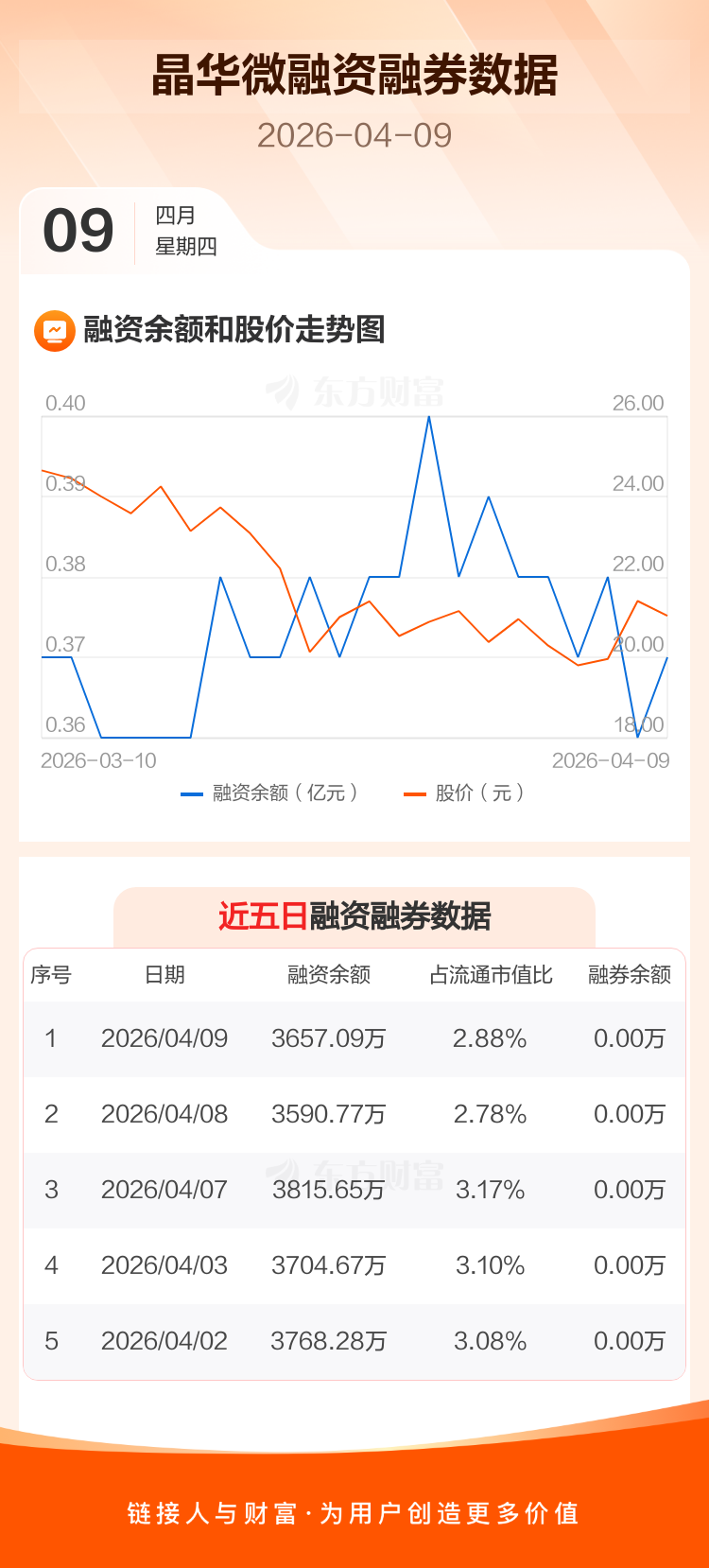 交易所最新数据显示,晶华微于2026年4月9日获融资买入283.50万元,融资偿还217.18万元,当日融资净买入66.32万元。目前,该股融资余额3657.09万,占流通市值比例为2.88%。