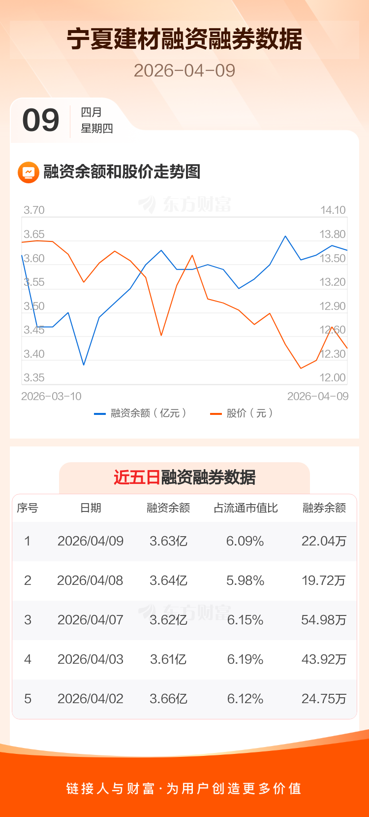 交易所最新数据显示,宁夏建材于2026年4月9日获融资买入620.31万元,融资偿还728.81万元,当日融资净偿还108.5万元。目前,该股融资余额3.63亿,占流通市值比例为6.09%。