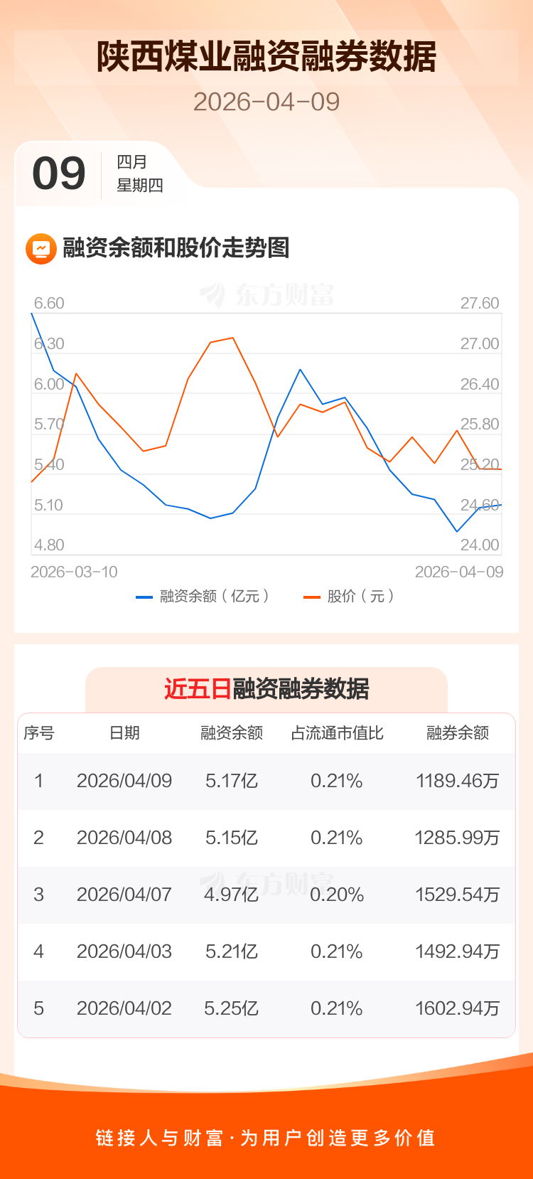 交易所最新数据显示,陕西煤业于2026年4月9日获融资买入3416.63万元,融资偿还3278.17万元,当日融资净买入138.45万元。目前,该股融资余额5.17亿,占流通市值比例为0.21%。