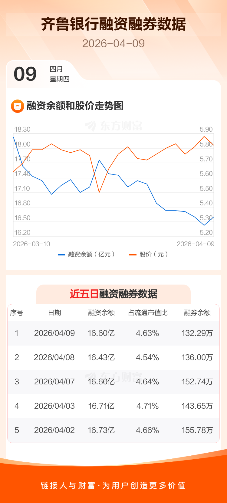 交易所最新数据显示,齐鲁银行于2026年4月9日获融资买入6240.16万元,融资偿还4607.40万元,当日融资净买入1632.77万元。目前,该股融资余额16.60亿,占流通市值比例为4.63%。