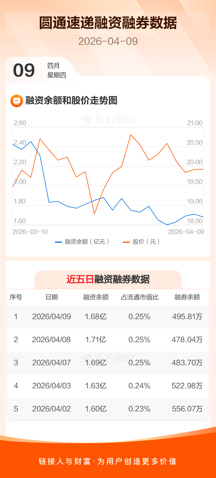交易所最新数据显示,圆通速递于2026年4月9日获融资买入804.57万元,融资偿还1053.52万元,当日融资净偿还248.96万元。目前,该股融资余额1.68亿,占流通市值比例为0.25%。