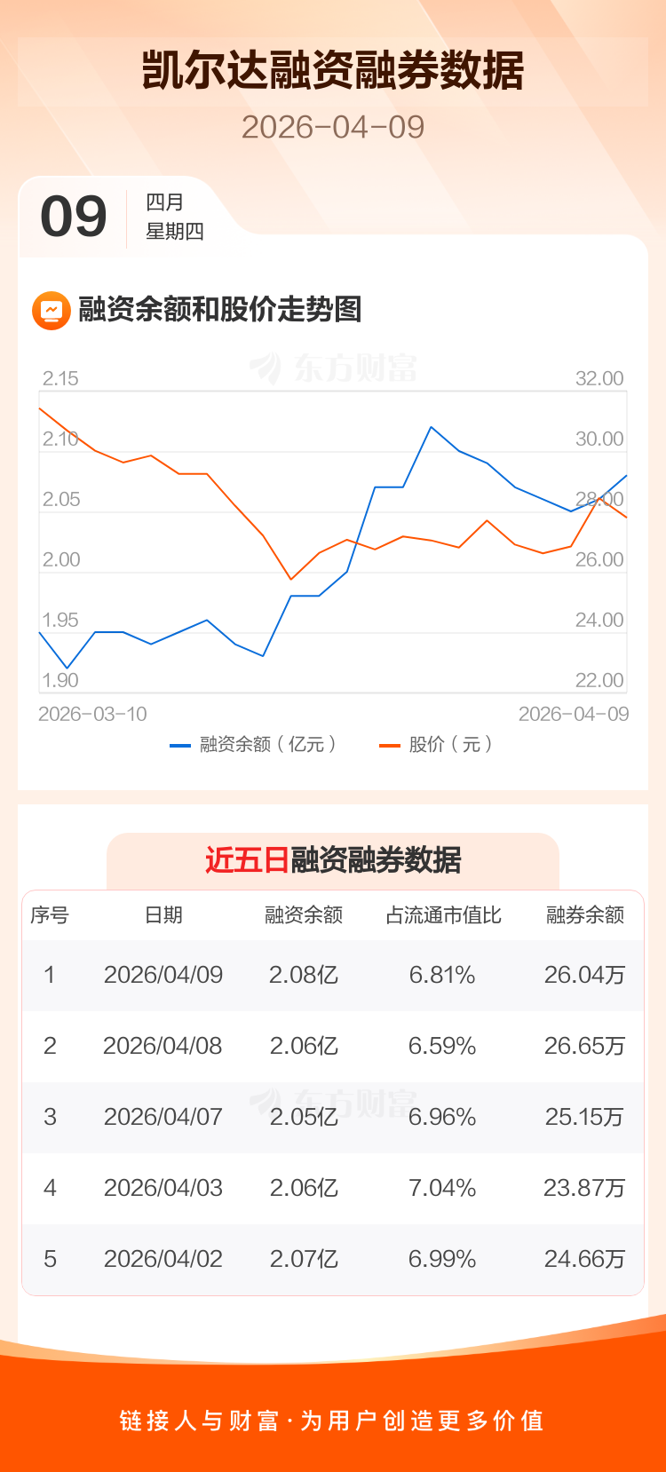 交易所最新数据显示,凯尔达于2026年4月9日获融资买入551.42万元,融资偿还368.64万元,当日融资净买入182.77万元。目前,该股融资余额2.08亿,占流通市值比例为6.81%。