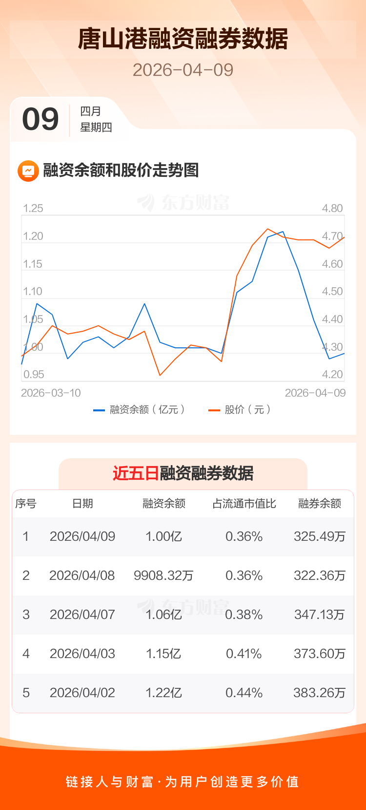 交易所最新数据显示,唐山港于2026年4月9日获融资买入1061.27万元,融资偿还966.52万元,当日融资净买入94.75万元。目前,该股融资余额1.00亿,占流通市值比例为0.36%。