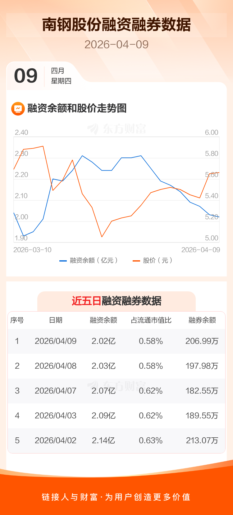 交易所最新数据显示,南钢股份于2026年4月9日获融资买入655.89万元,融资偿还756.09万元,当日融资净偿还100.2万元。目前,该股融资余额2.02亿,占流通市值比例为0.58%。