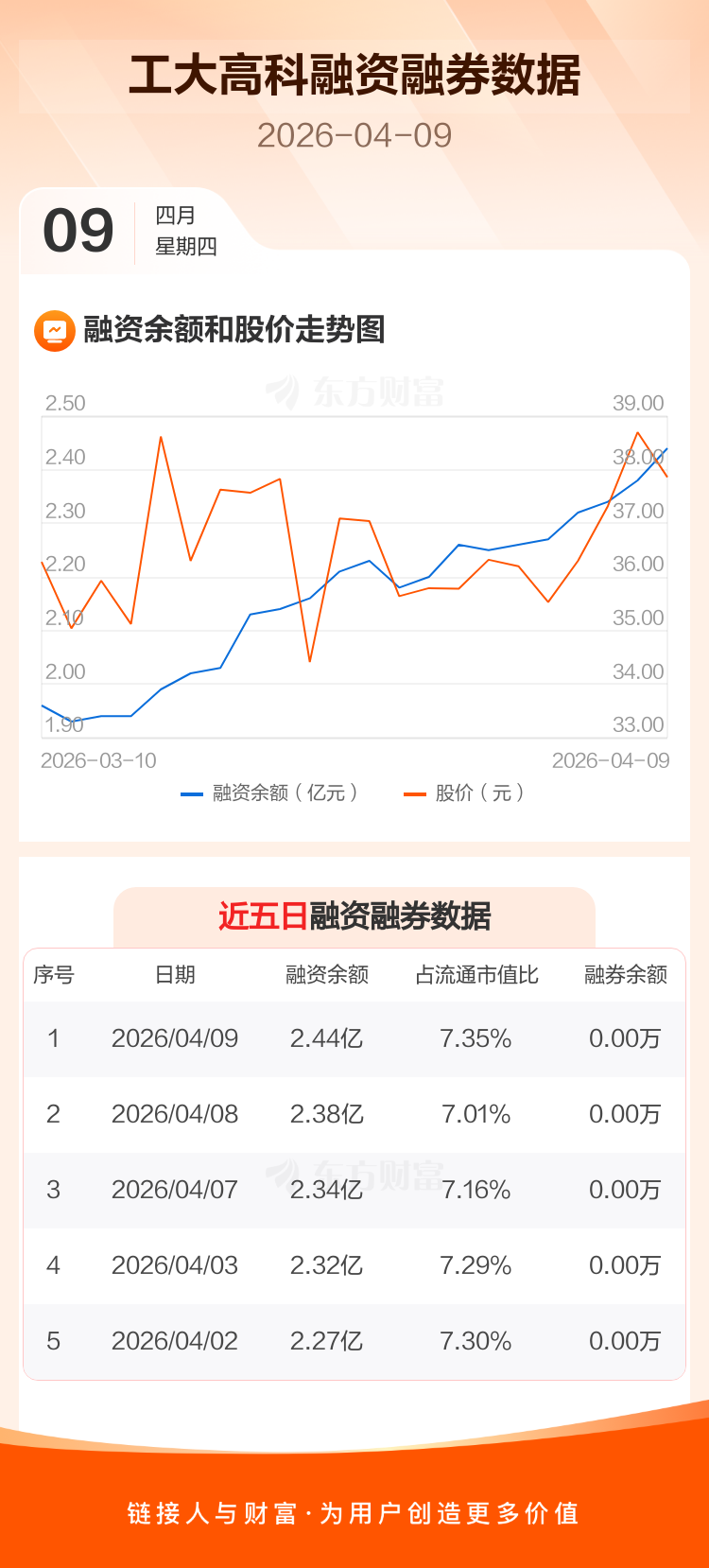 交易所最新数据显示,工大高科于2026年4月9日获融资买入1798.46万元,融资偿还1156.29万元,当日融资净买入642.16万元。目前,该股融资余额2.44亿,占流通市值比例为7.35%。