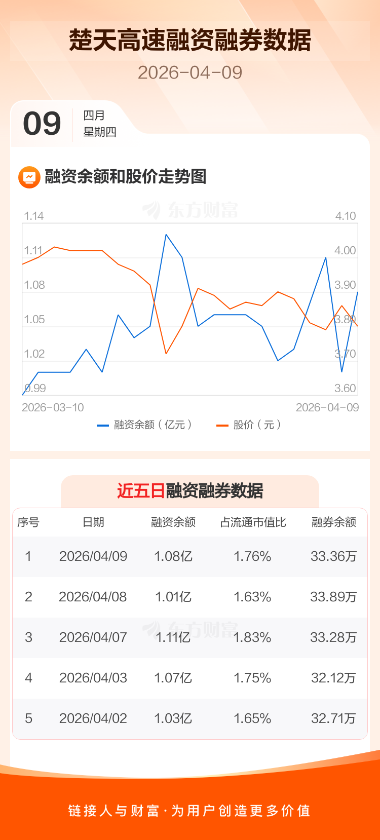 交易所最新数据显示,楚天高速于2026年4月9日获融资买入995.40万元,融资偿还331.01万元,当日融资净买入664.4万元。目前,该股融资余额1.08亿,占流通市值比例为1.76%。