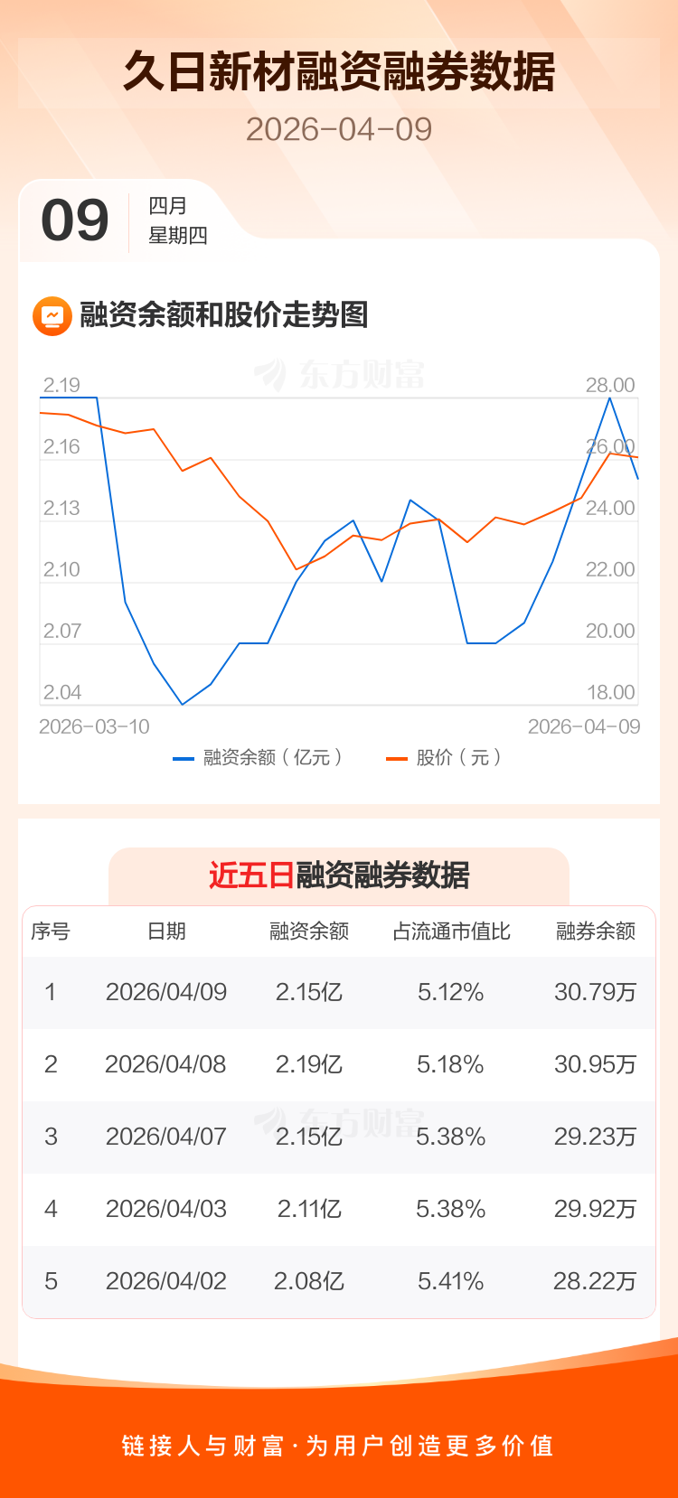 交易所最新数据显示,久日新材于2026年4月9日获融资买入736.47万元,融资偿还1137.10万元,当日融资净偿还400.63万元。目前,该股融资余额2.15亿,占流通市值比例为5.12%。