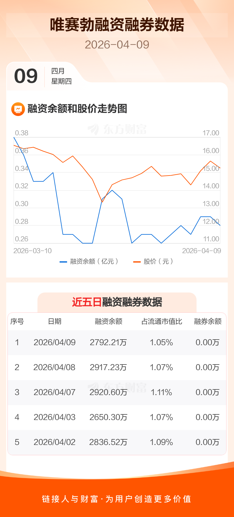 交易所最新数据显示,唯赛勃于2026年4月9日获融资买入224.10万元,融资偿还349.12万元,当日融资净偿还125.02万元。目前,该股融资余额2792.21万,占流通市值比例为1.05%。