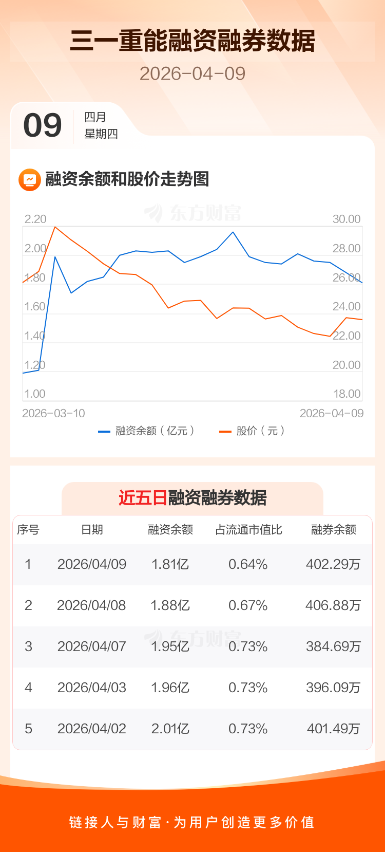 交易所最新数据显示,三一重能于2026年4月9日获融资买入778.21万元,融资偿还1488.46万元,当日融资净偿还710.25万元。目前,该股融资余额1.81亿,占流通市值比例为0.64%。