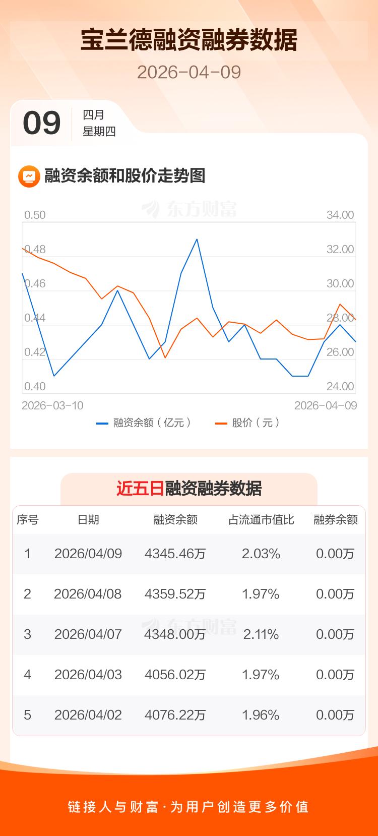 交易所最新数据显示,宝兰德于2026年4月9日获融资买入343.14万元,融资偿还357.20万元,当日融资净偿还14.06万元。目前,该股融资余额4345.46万,占流通市值比例为2.03%。