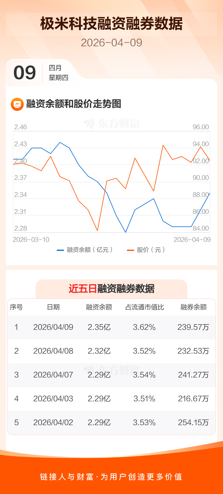 交易所最新数据显示,极米科技于2026年4月9日获融资买入695.02万元,融资偿还449.53万元,当日融资净买入245.49万元。目前,该股融资余额2.35亿,占流通市值比例为3.62%。