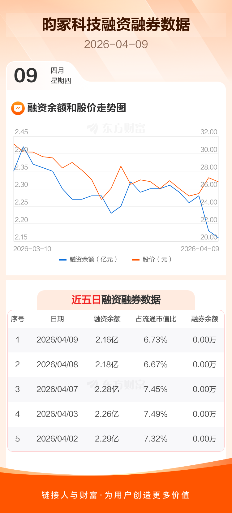 交易所最新数据显示,昀冢科技于2026年4月9日获融资买入1370.64万元,融资偿还1555.21万元,当日融资净偿还184.57万元。目前,该股融资余额2.16亿,占流通市值比例为6.73%。