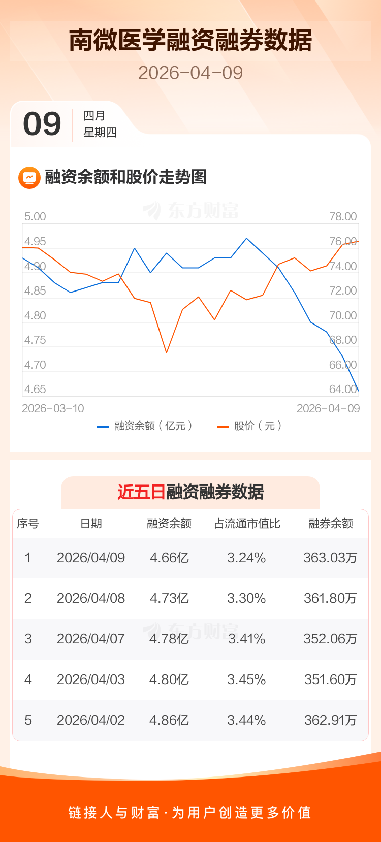 交易所最新数据显示,南微医学于2026年4月9日获融资买入653.61万元,融资偿还1379.71万元,当日融资净偿还726.11万元。目前,该股融资余额4.66亿,占流通市值比例为3.24%。