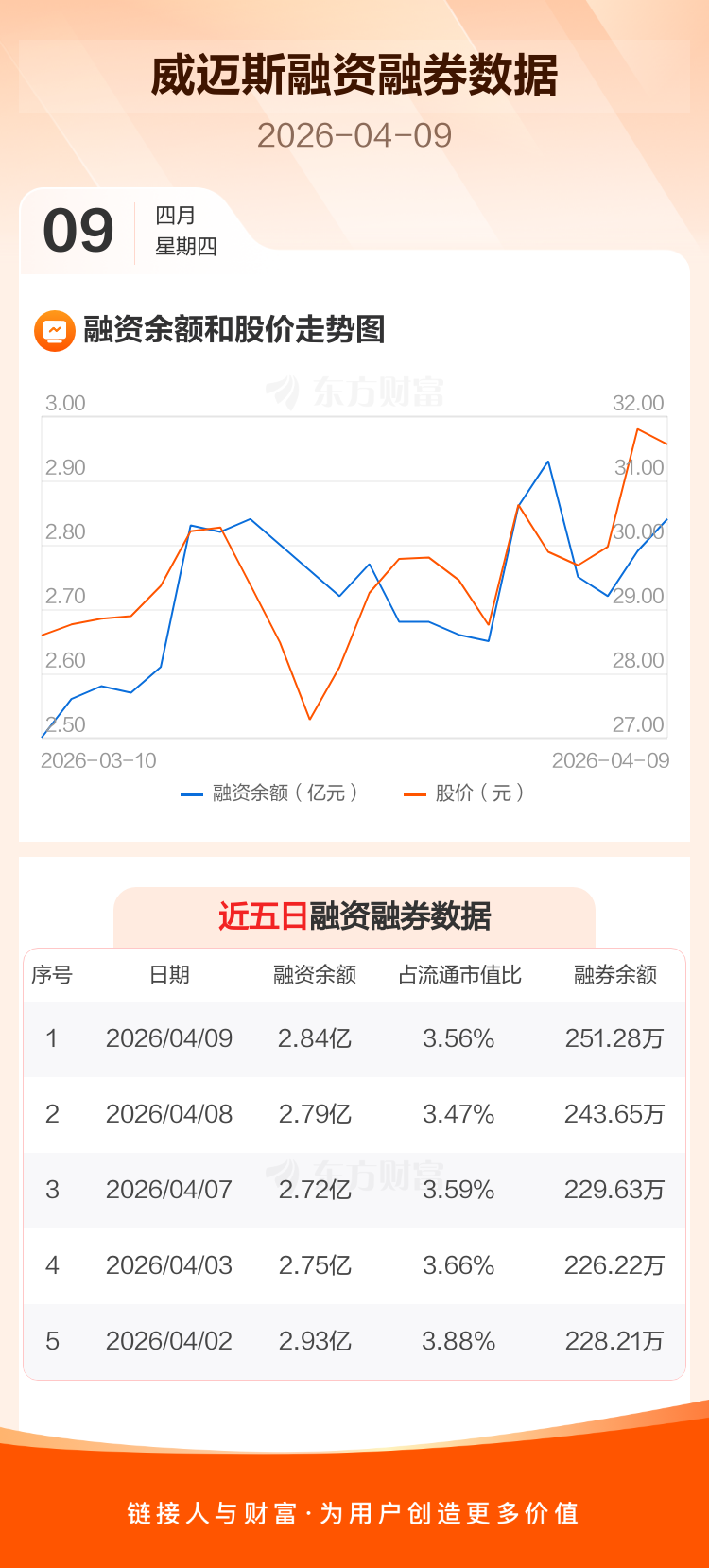 交易所最新数据显示,威迈斯于2026年4月9日获融资买入1585.21万元,融资偿还1038.41万元,当日融资净买入546.8万元。目前,该股融资余额2.84亿,占流通市值比例为3.56%。