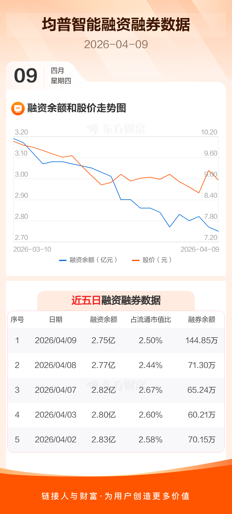 交易所最新数据显示,均普智能于2026年4月9日获融资买入644.55万元,融资偿还833.89万元,当日融资净偿还189.34万元。目前,该股融资余额2.75亿,占流通市值比例为2.50%。