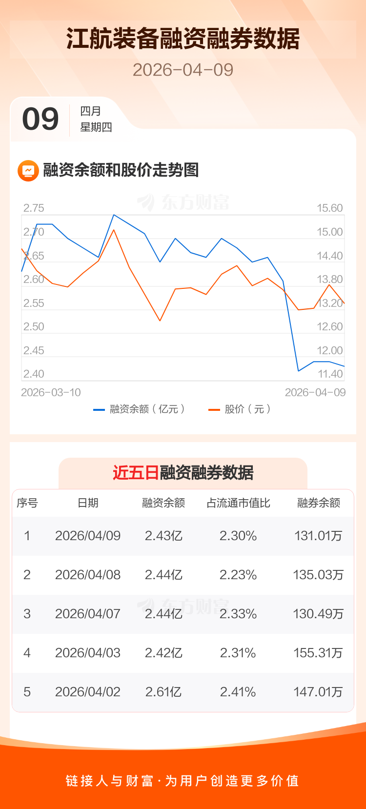 交易所最新数据显示,江航装备于2026年4月9日获融资买入919.50万元,融资偿还1002.29万元,当日融资净偿还82.78万元。目前,该股融资余额2.43亿,占流通市值比例为2.30%。